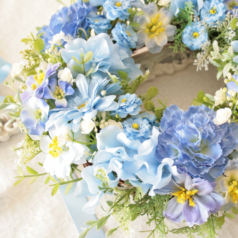 青のニュアンスを丁寧に重ねたフラワーリースです。