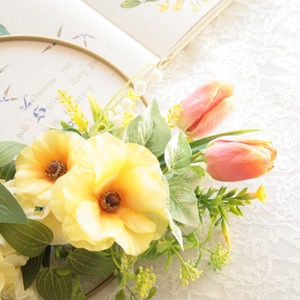 やわらかな色合いの春のお花を束ねた、可憐なフラワーリースです。