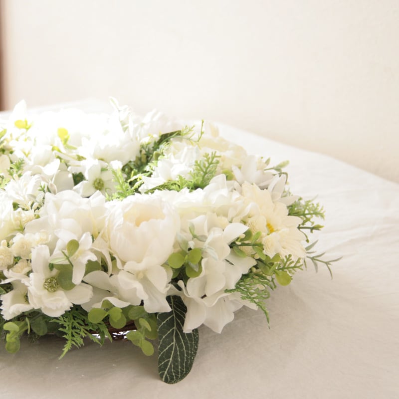 「永遠」を象徴する丸いリースに、純白の花々を咲かせました。