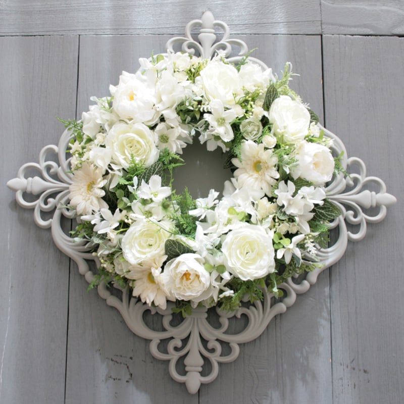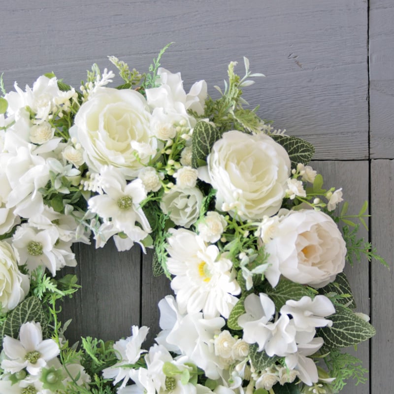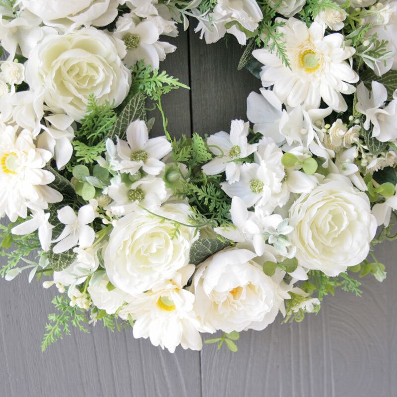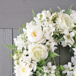 ガーデンローズと小花のホワイトリース エレガントな白いフラワーリース