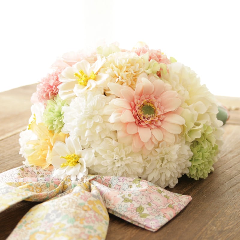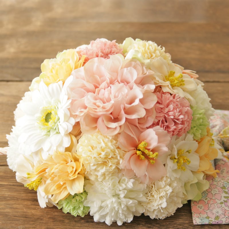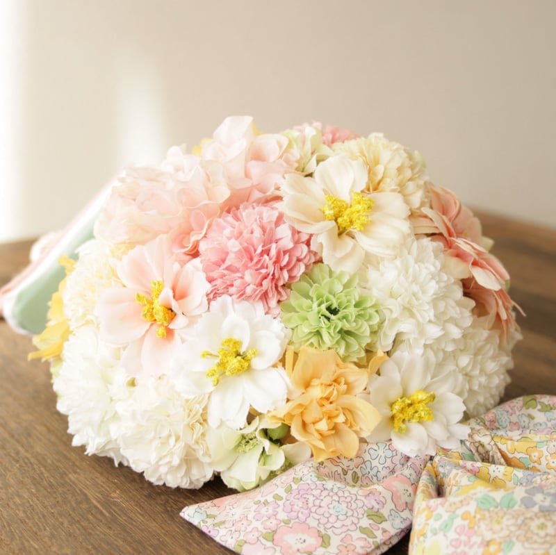 雛祭りを思わせるやさしいパステルカラーで仕上げた春色のフラワーボールです。