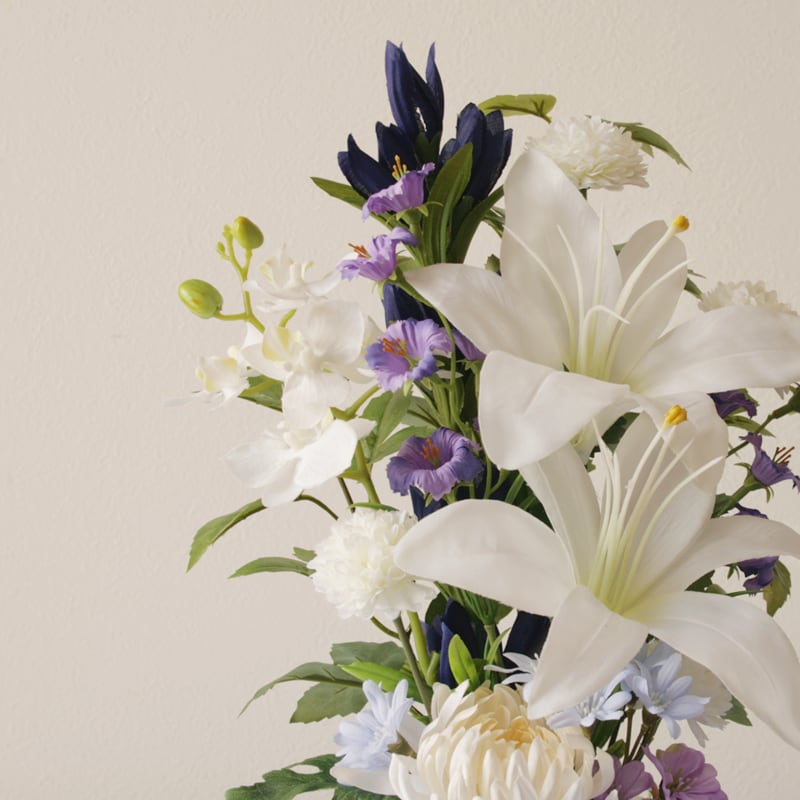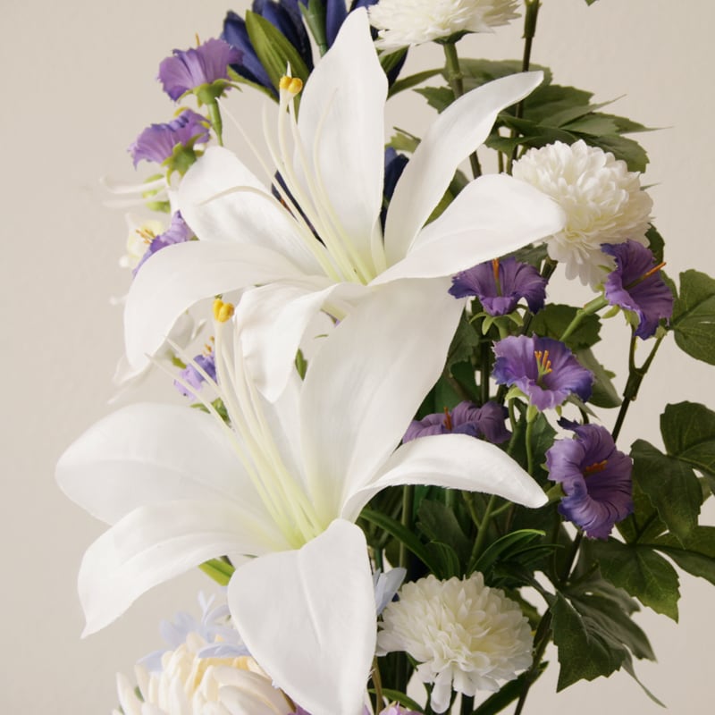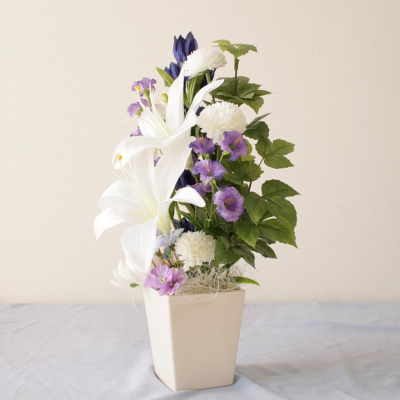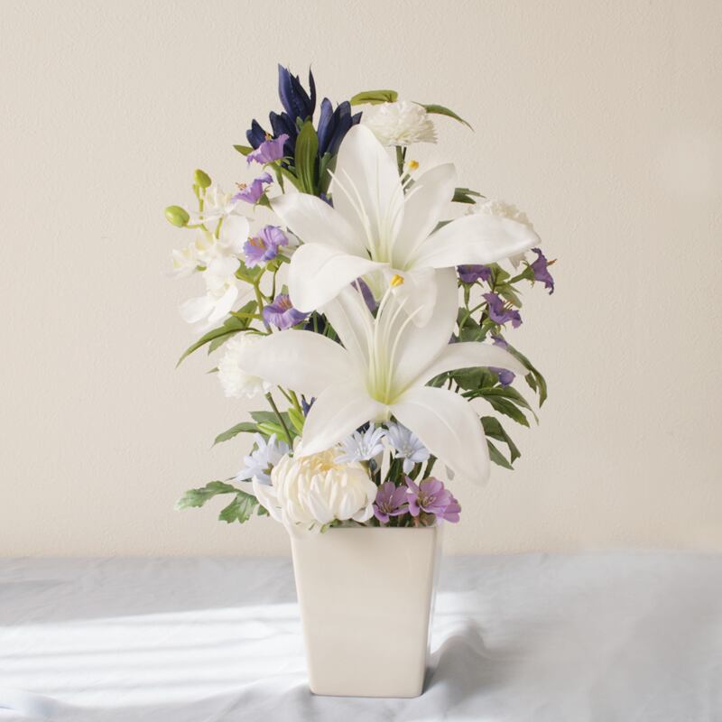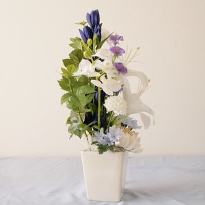 花器付き仏花 白ユリ・菊・胡蝶蘭・りんどう(造花)