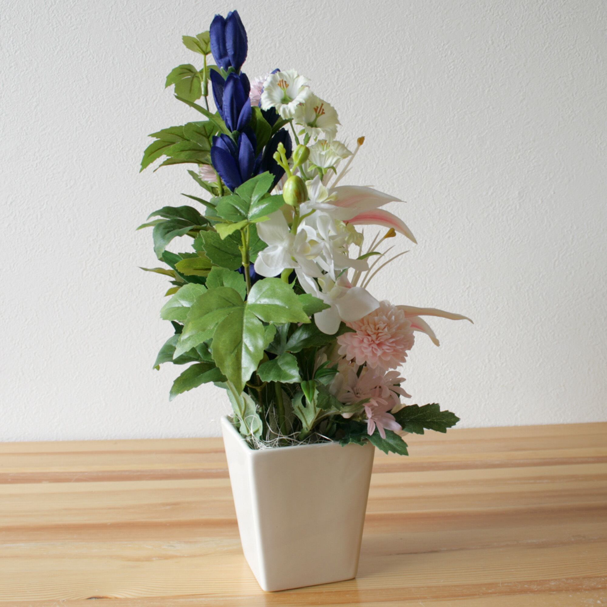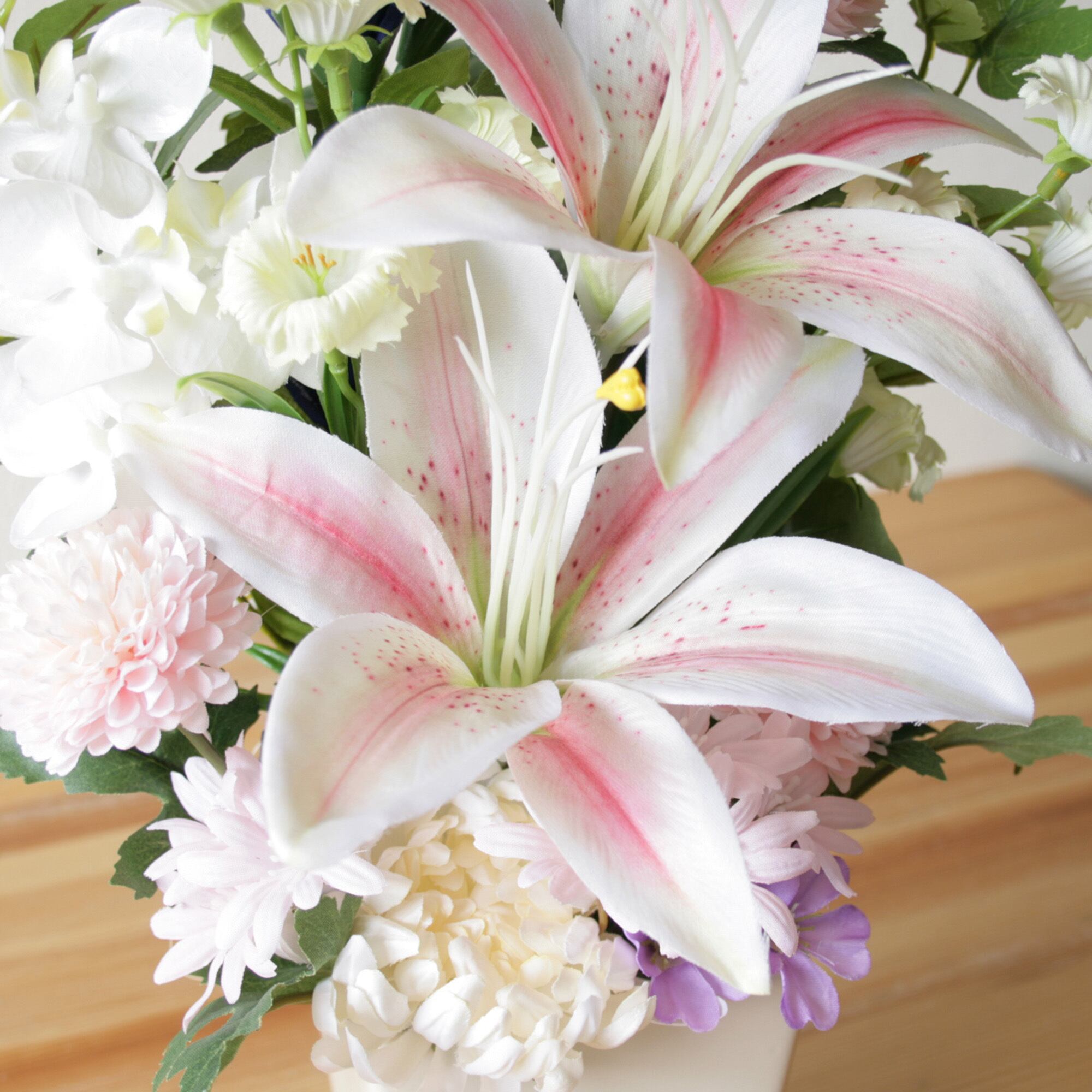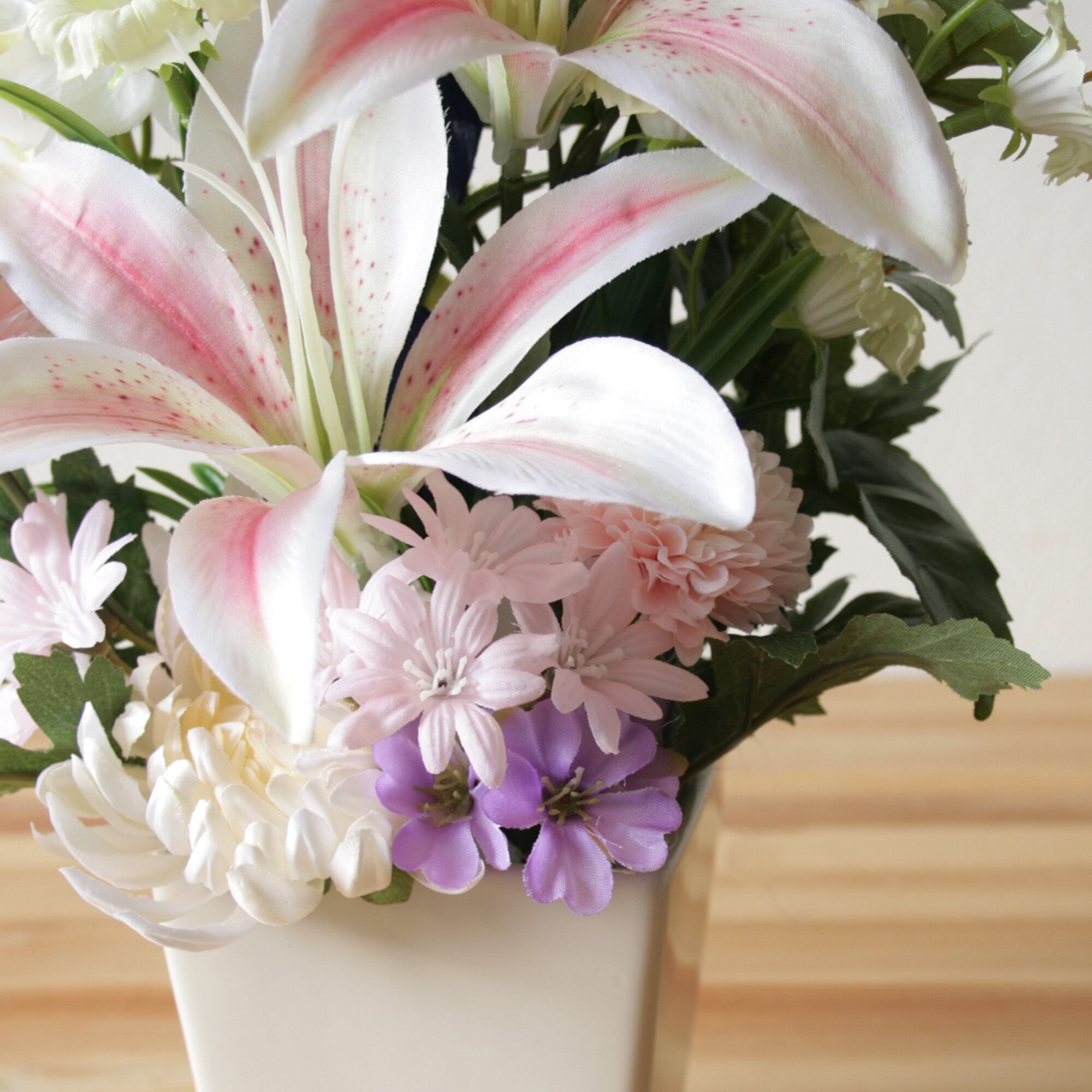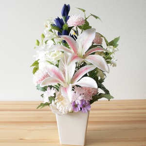 花器付き仏花 ピンクユリ・菊・胡蝶蘭・りんどう(造花)