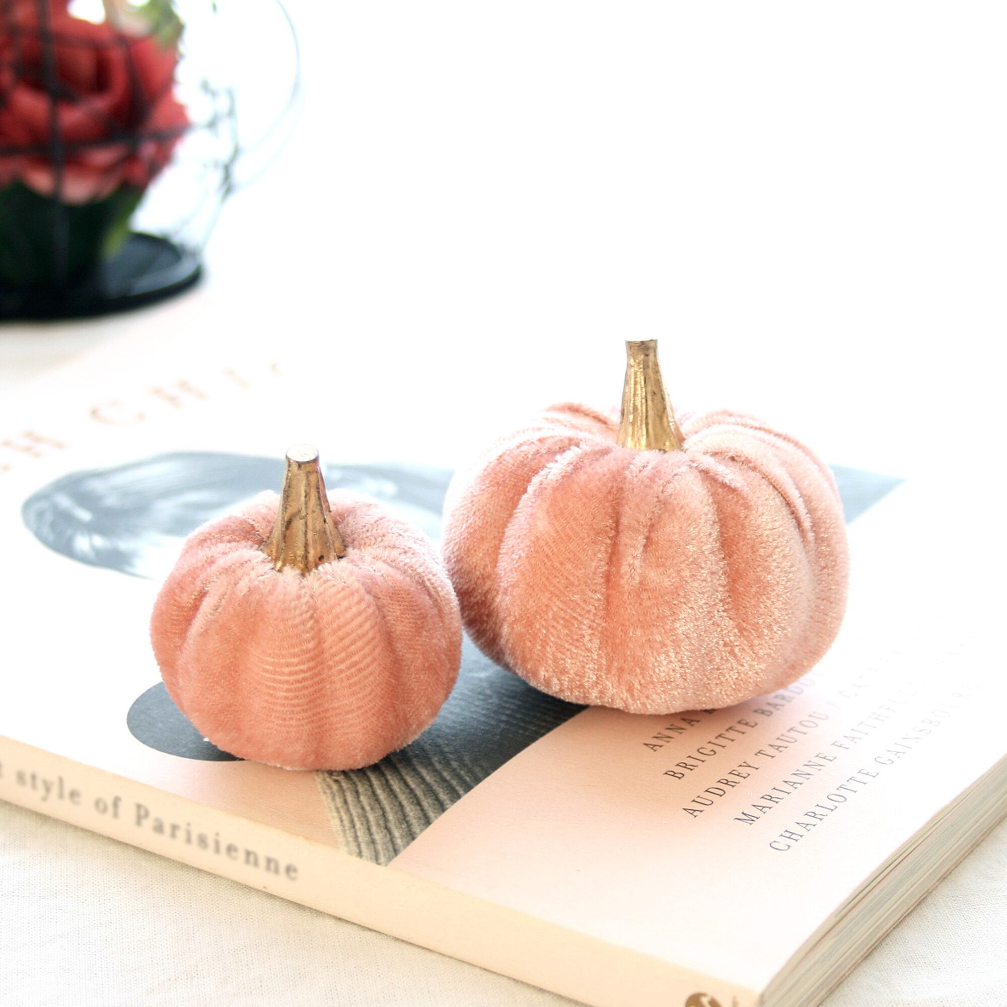 アクセントには、ピンクのベルベット調パンプキンを2個お付けしています。