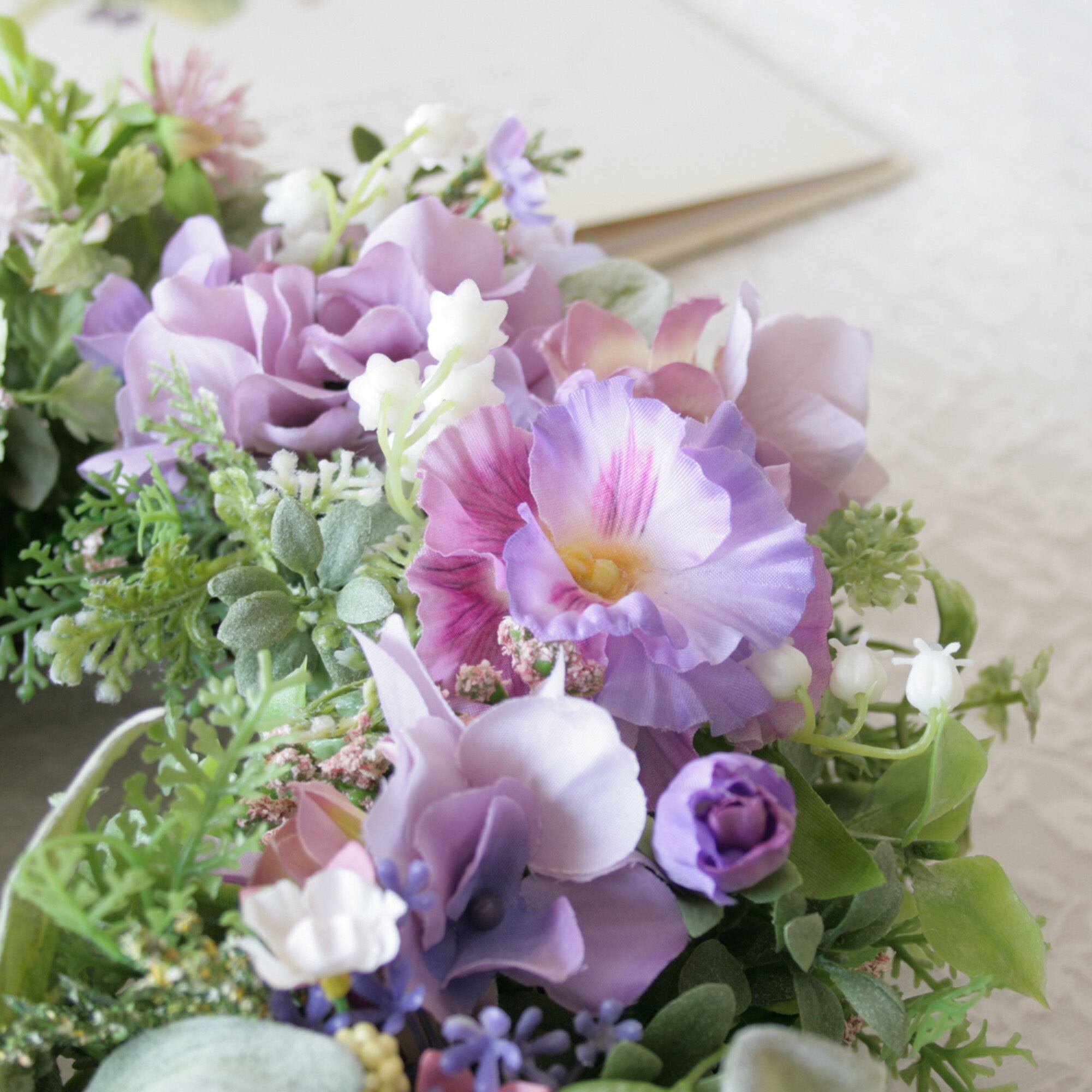 淡いパープルの花々を重ね、