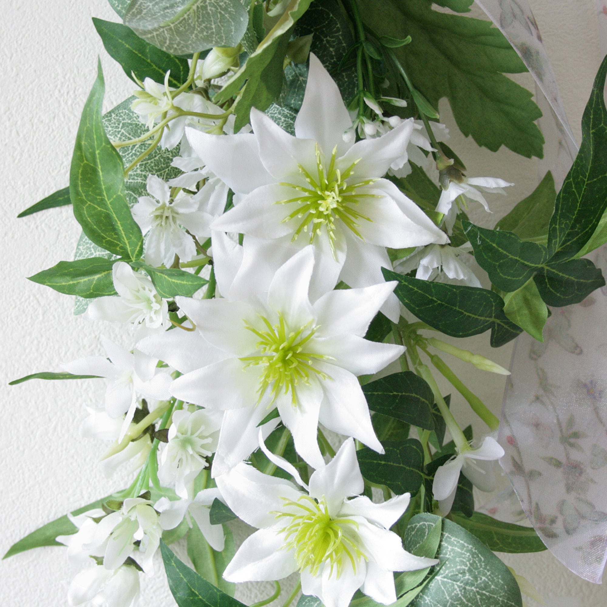 流れるラインが美しい 白クレマチスとジャスミンのナチュラルスワッグ